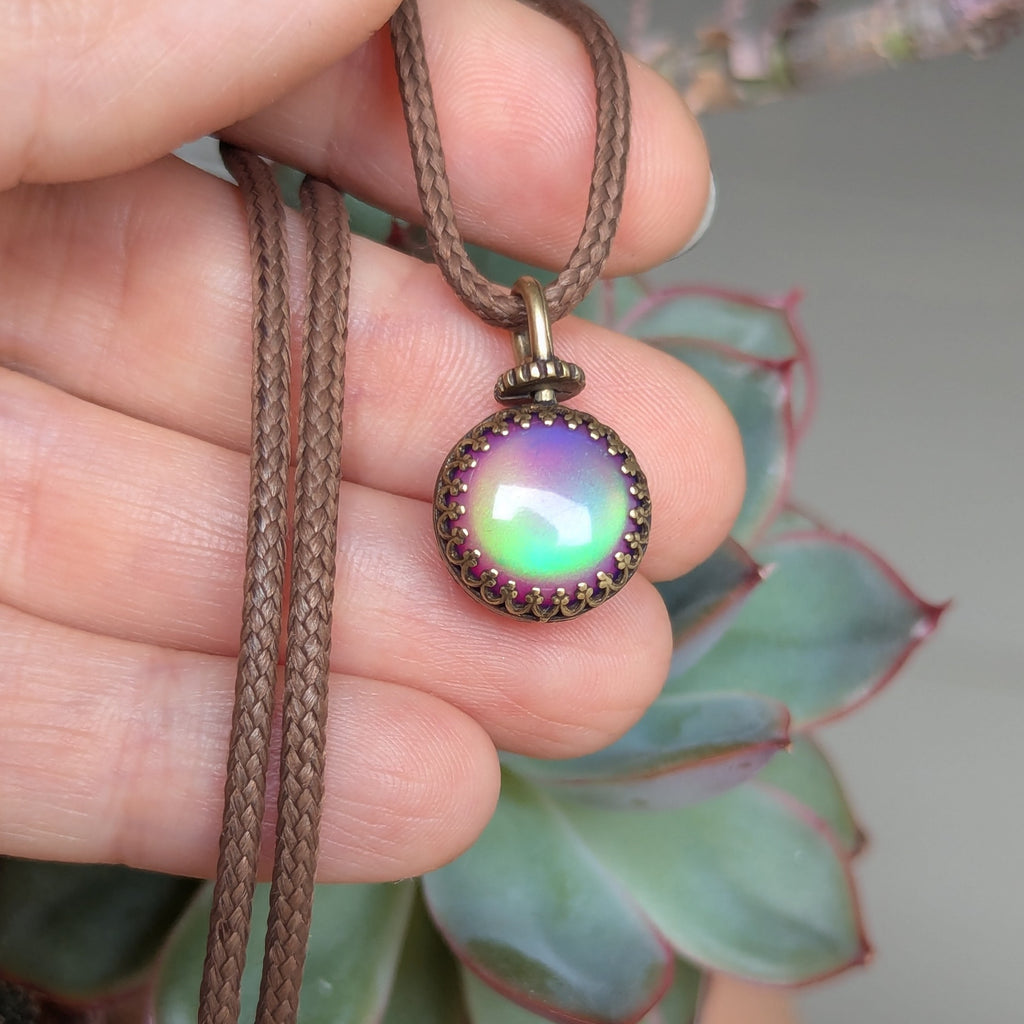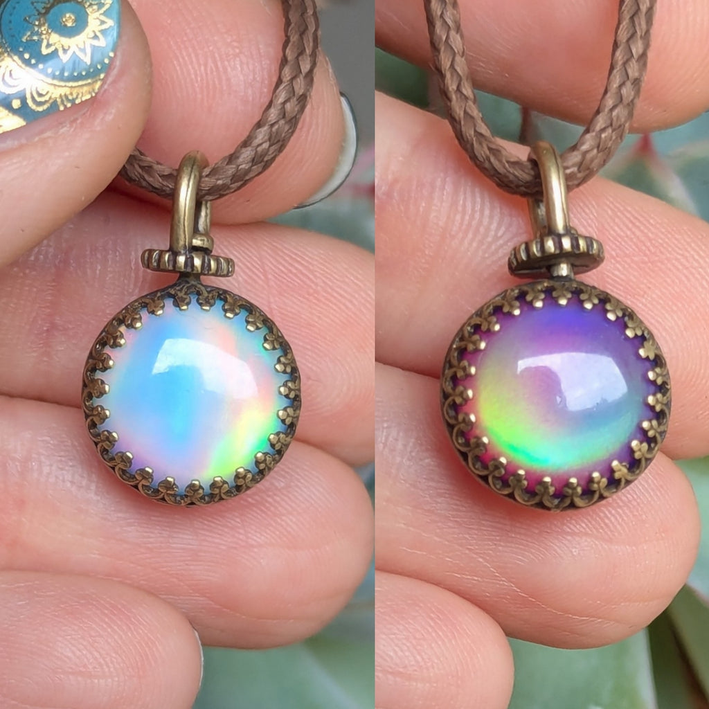 The stones are Aurora opal, which is a type of man-made opal. The pendant is a swivel reversible pendant and has different color opals on the front vs the back (see video).