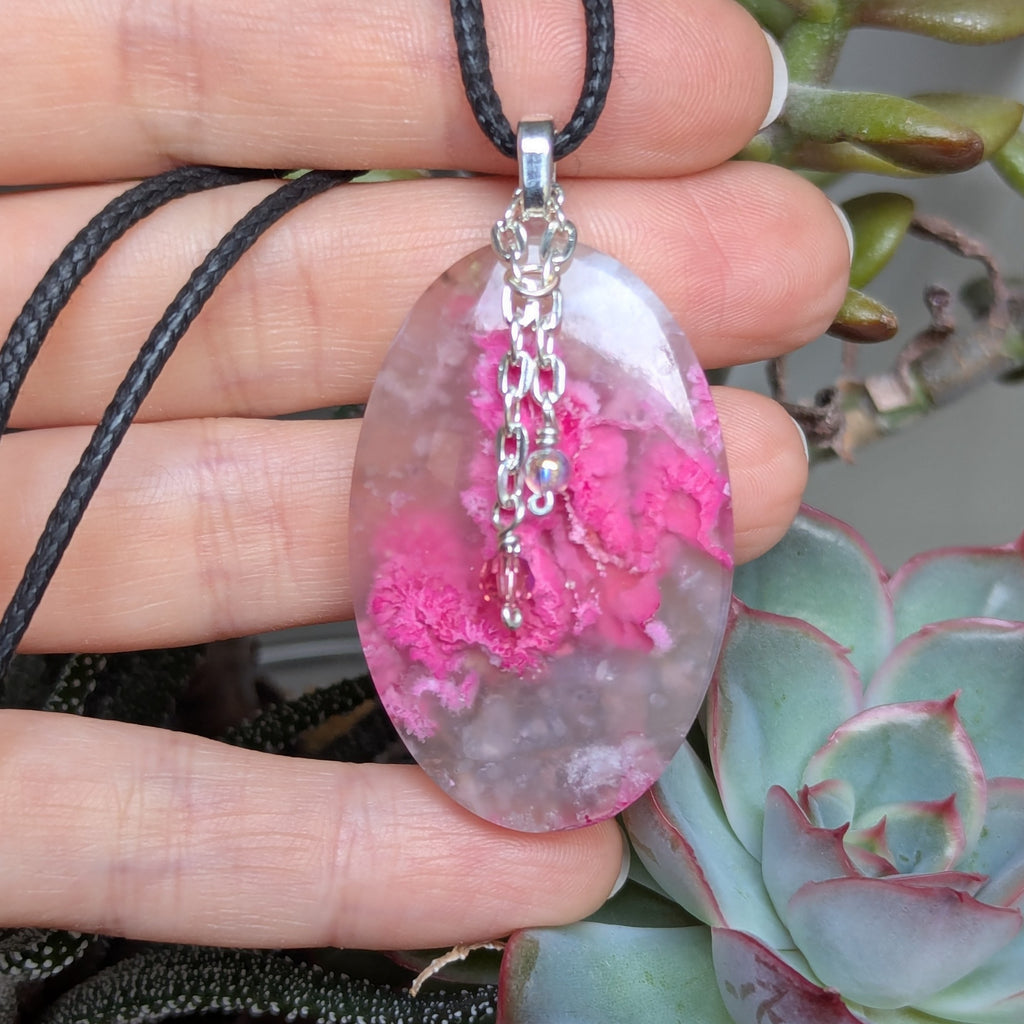 The pendant features a silver-plated glue on bail and silver-filled wire. The cord necklace is included, it is nylon and is adjustable roughly 18"-20". The last photo shows back of the pendant, it is next to a ruler for size comparison.