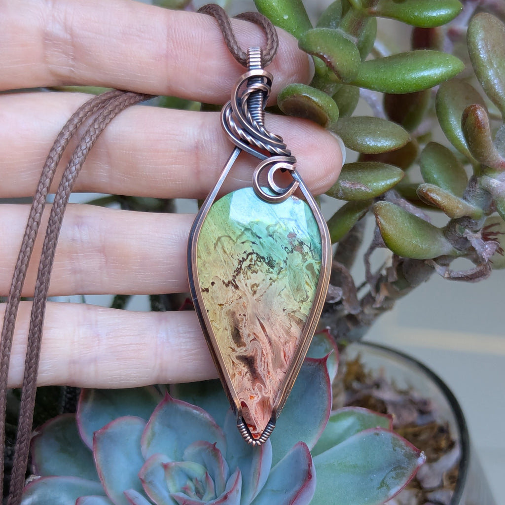 Dyed Rainbow Palm Root Wire Wrapped Pendant in Oxidized Copper