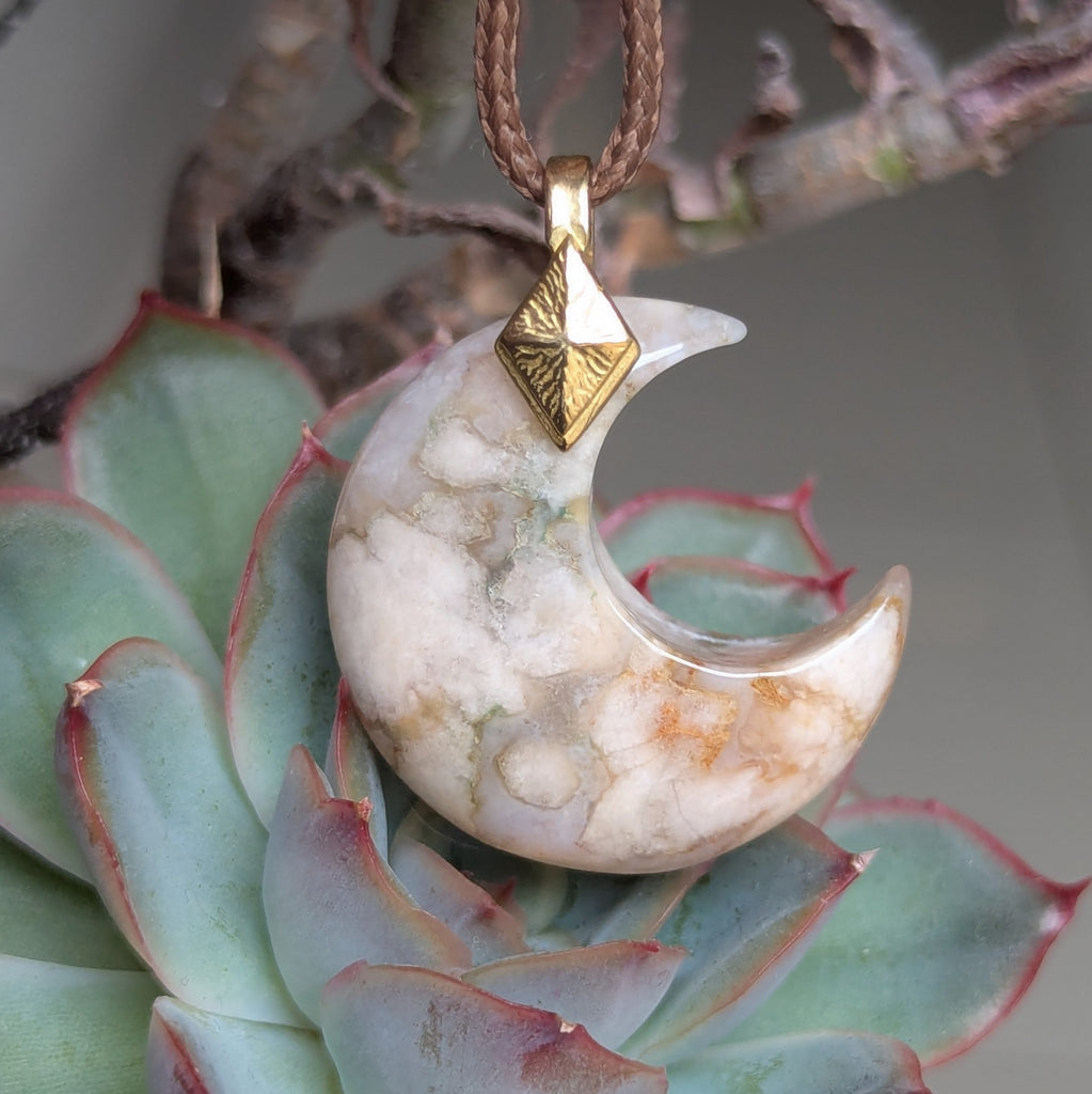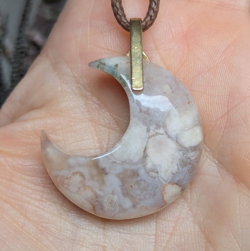 The stone is a Flower Agate. It features a pinch bail that is made of Brass.