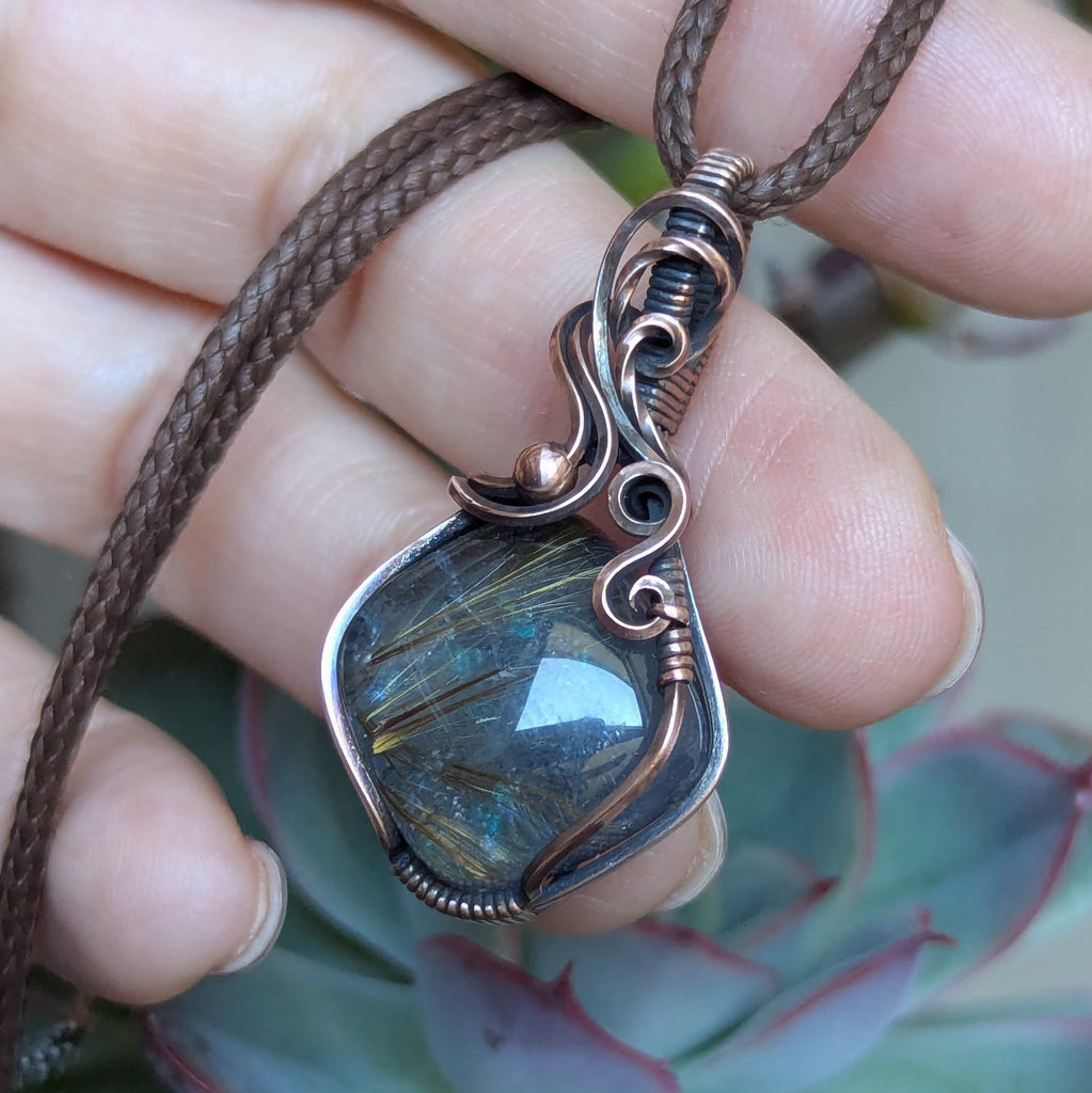 Golden Rutile Quartz Doublet Wire Wrapped Pendant in Oxidized Copper
