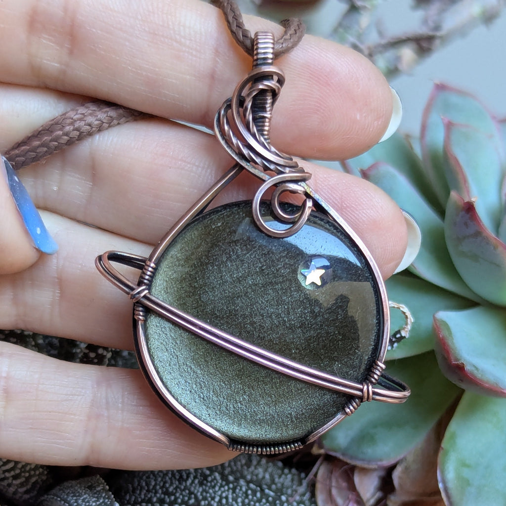 Golden Sheen Obsidian Wire Wrapped Planet Pendant in Oxidized Copper