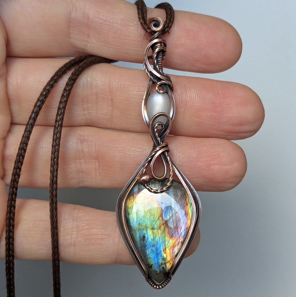Labradorite & Silky Moonstone Wire Wrapped Oxidized Copper Pendant