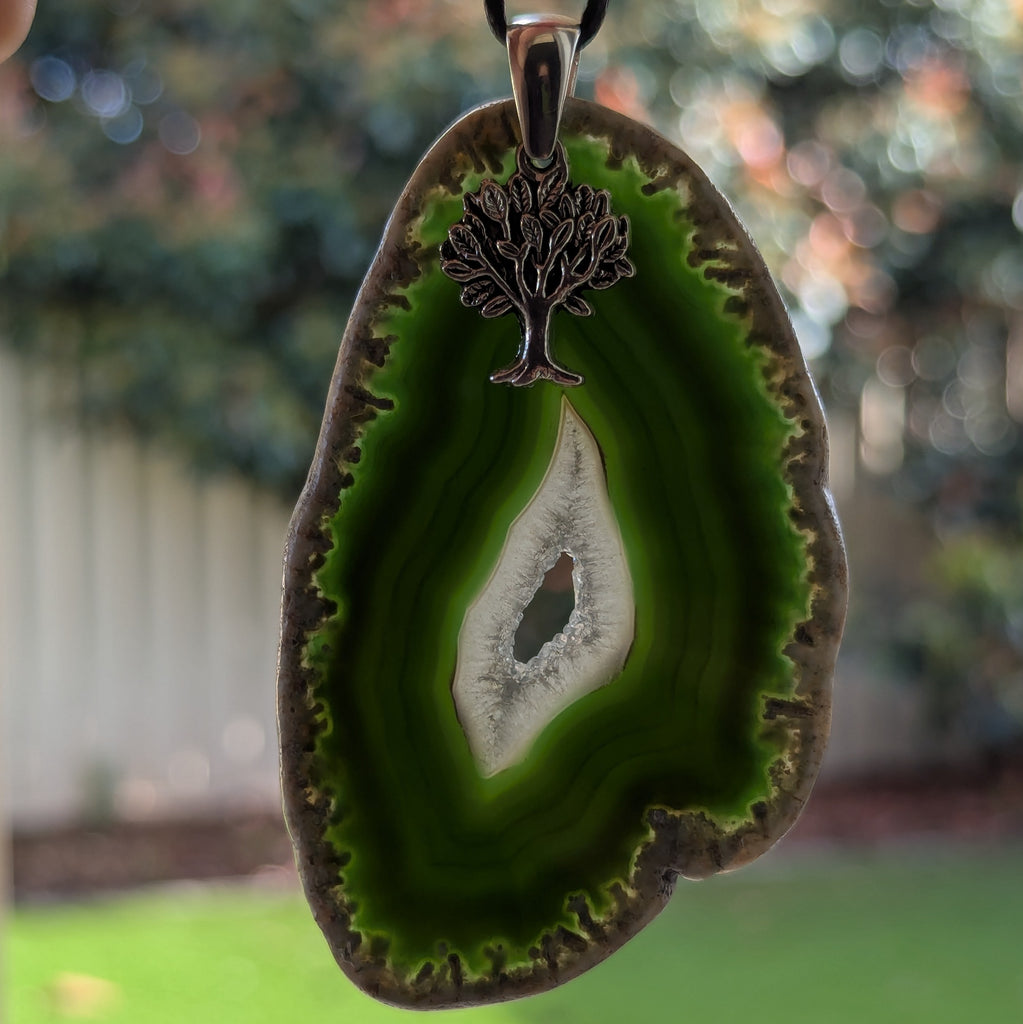 The stone is a dyed Agate geode slice, please note it is very large. The bail is solid sterling silver and the little tree charm is an unknown metal.
