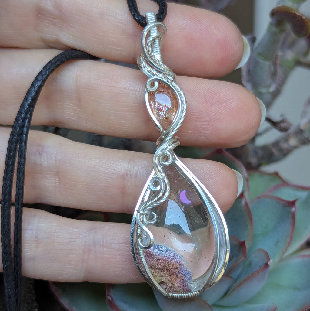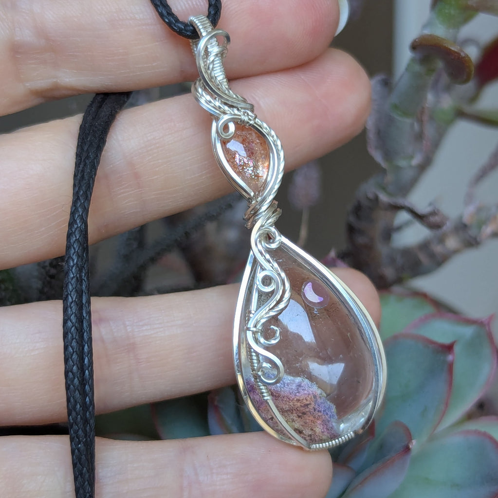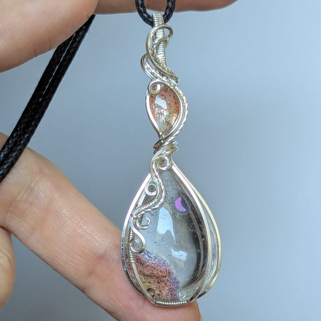Lodolite Quartz & Sunstone Wire Wrapped Pendant in Sterling Silver
