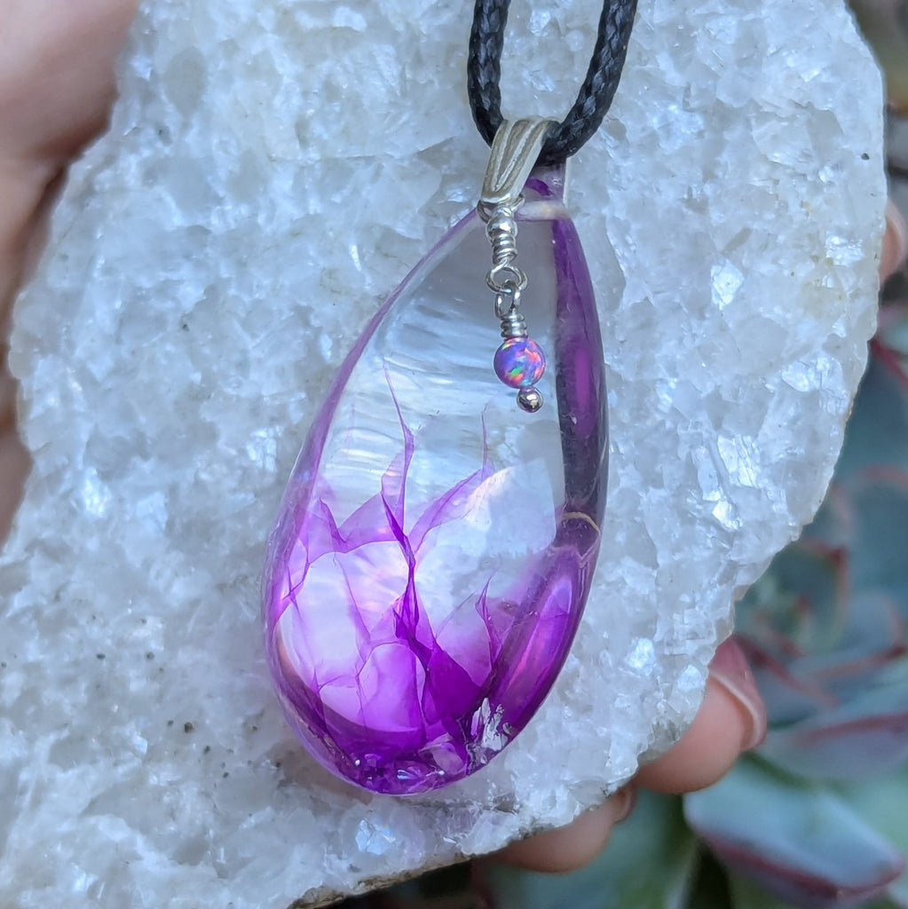 The stone is a dyed Quartz called Phantom Quartz. The tiny bead is synthetic opal.