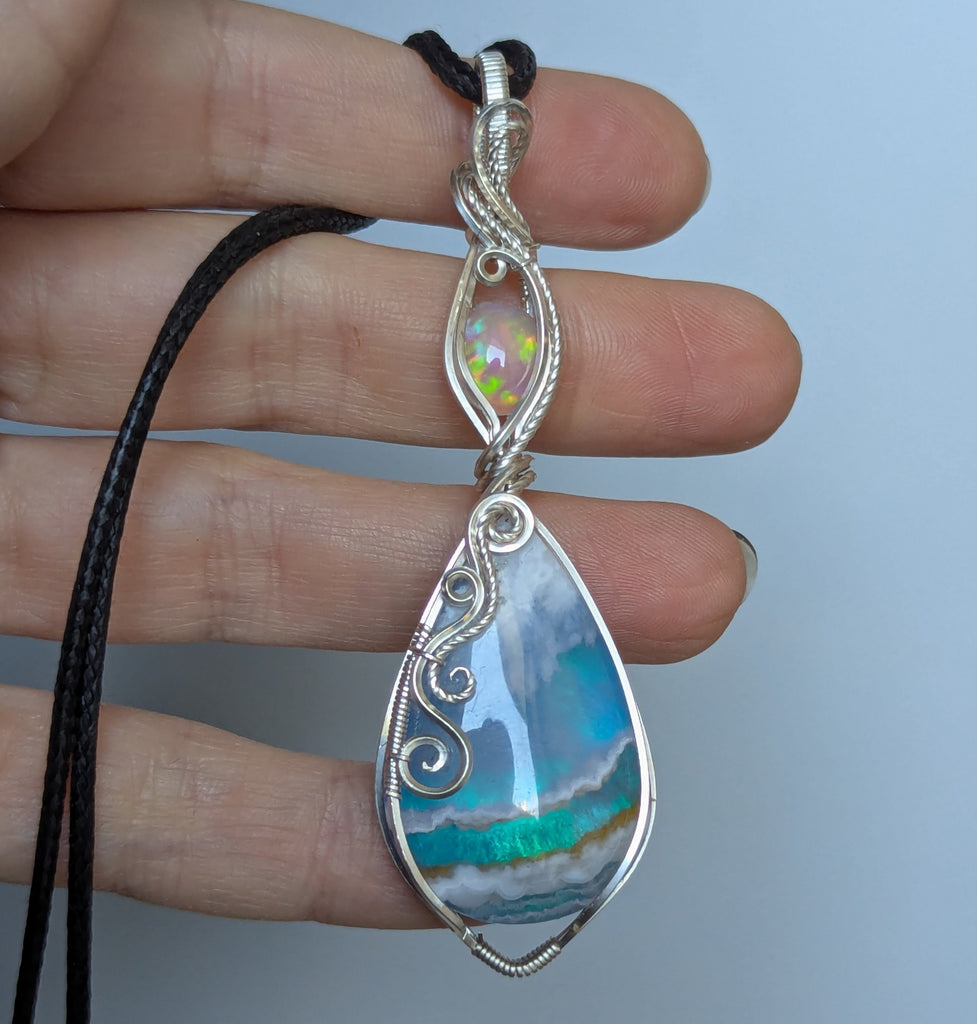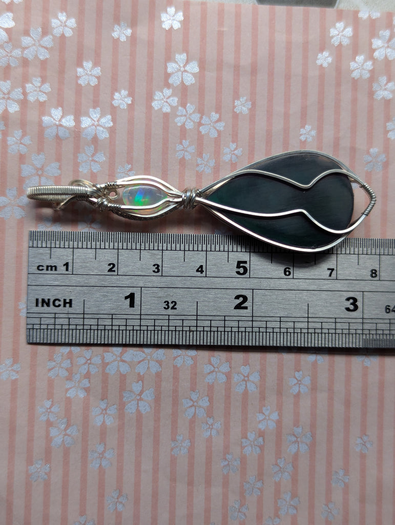 Plume Agate Doublet & Welo Opal Wire Wrapped Pendant in Sterling Silver