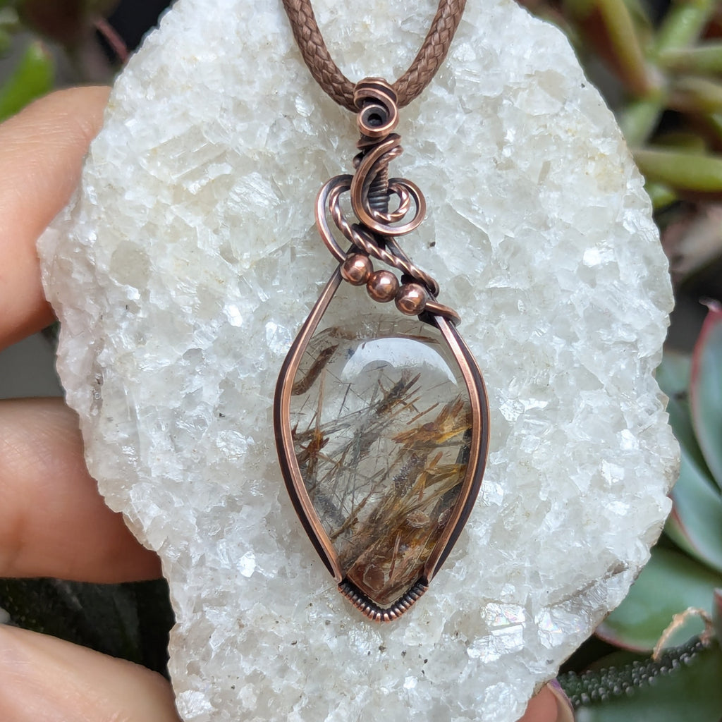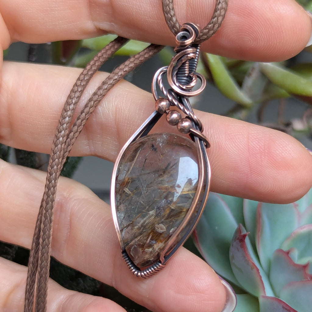 Rutile Quartz Wire Wrapped Oxidized Copper Pendant