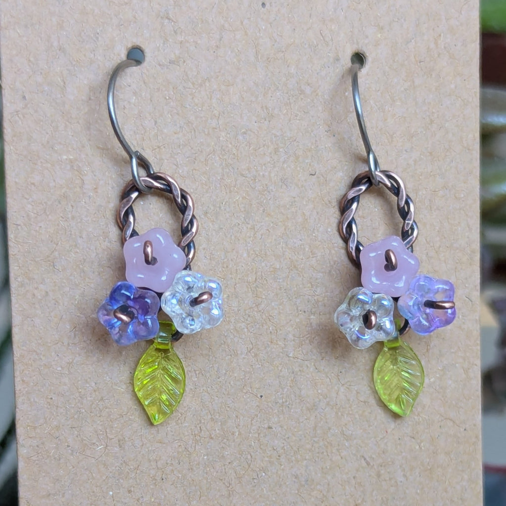 The flowers are pressed glass and the leaves are acrylic. The earring hooks are titanium.