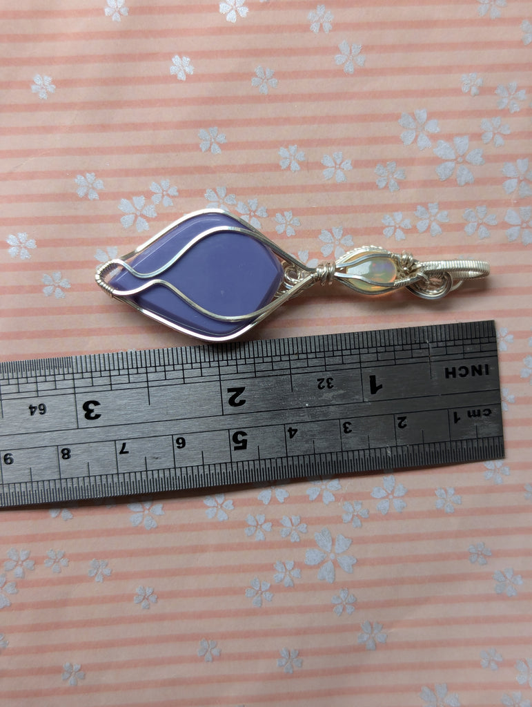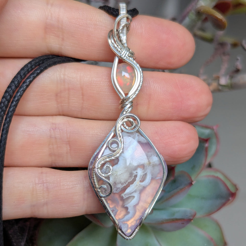 Plume Agate Doublet & Welo Opal Wire Wrapped Pendant in Sterling Silver