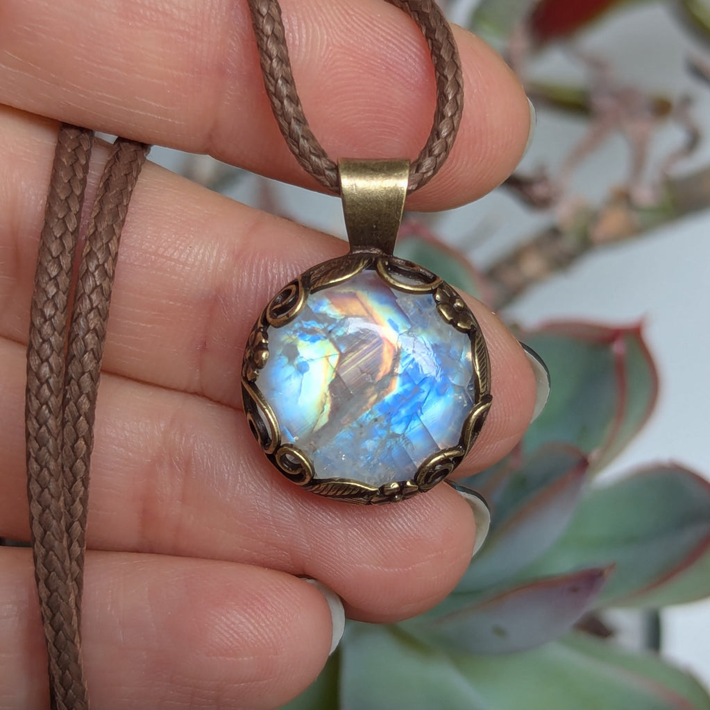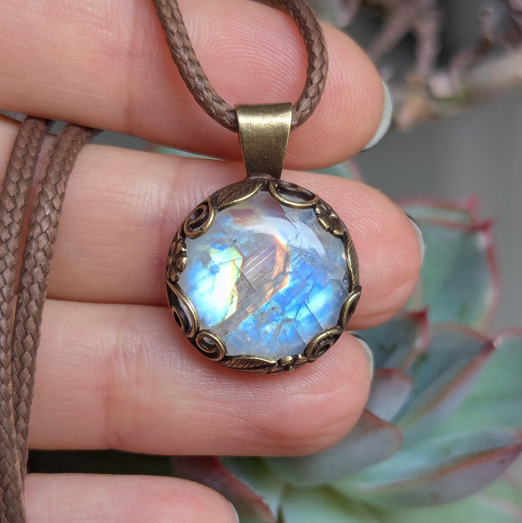 Rainbow Moonstone Pendant in Antique Brass